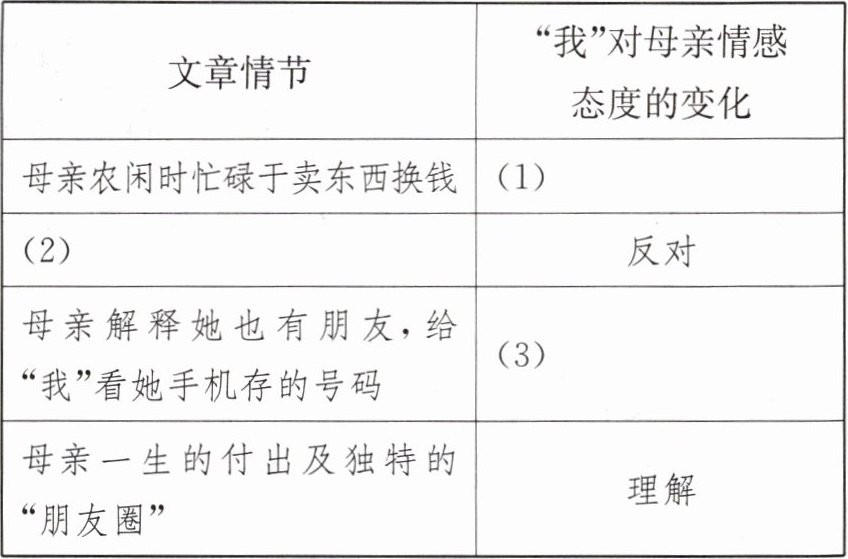 (3)根据情节“母亲解释她也有朋友,给‘我’看她手机存的号码”可定位至文章第⑫段,根据“母亲又说:‘我在这边也是有朋友的,你看我手机里全都存着他们的号码——收衣服的,收纸盒的,还有收废铁的……’母亲戴上老花眼镜,拿着她的老人手机,一个个翻给我看”,第⑬段“我鼻子一酸,突然心疼起母亲来”可知,母亲解释自己也有朋友并展示手机存的号码,这让“我”意识到她的不容易,从而感到心疼。