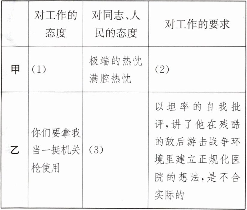 | 乙 | 你们要拿我当一挺机关枪使用 | (3) | 以坦率的自我批评,讲了他在残酷的敌后游击战争环境里建立正规化医院的想法,是不合实际的 |