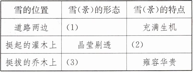 8 秦岭不同地方的雪(景)形态不同,给人的感受也是不同的。请结合文章第⑤~⑦段,完成下面的表格。