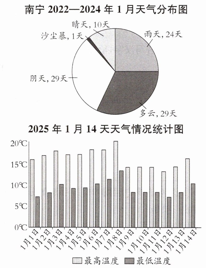 (2)跨学科 分析天气数据 为了让外地游客更好地了解南宁的天气情况,小文制作了南宁市天气数据统计图,请你概括南宁这一时期的天气特点,并给外地游客提供两条旅游建议。