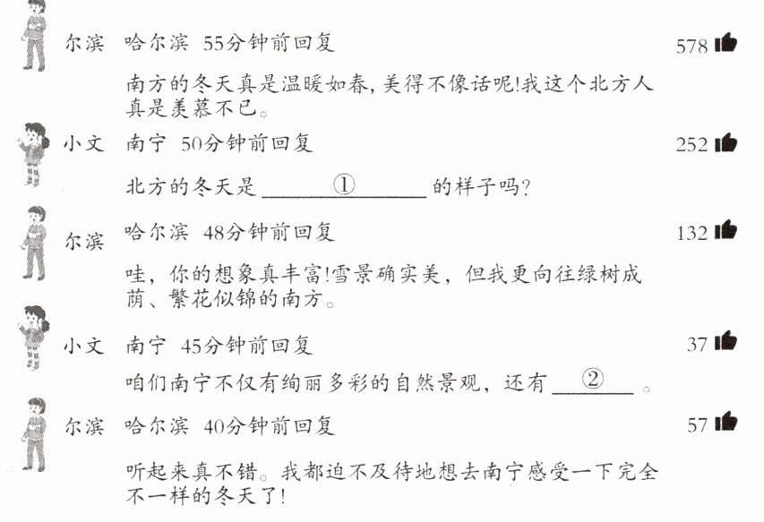 (1)新情境 补全网友留言 上述推文发出之后,引发了网友在留言区的讨论,请补全他们的对话。