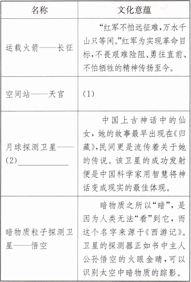 9 文化自信 我国航天器的名称大多带有传统文化意蕴,请你完成下面的表格。