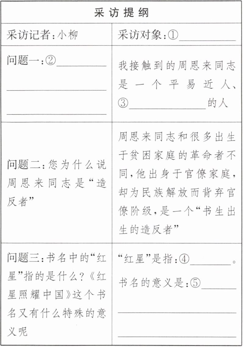 (1)中考新考法 完善采访提纲 【任务一:跨越时空,对话经典】小柳同学很喜欢书中的周恩来同志,并且想更深入了解《红星照耀中国》,于是跨越时空,采访了这本名著的作者。请你结合全书,将采访提纲补充完整。