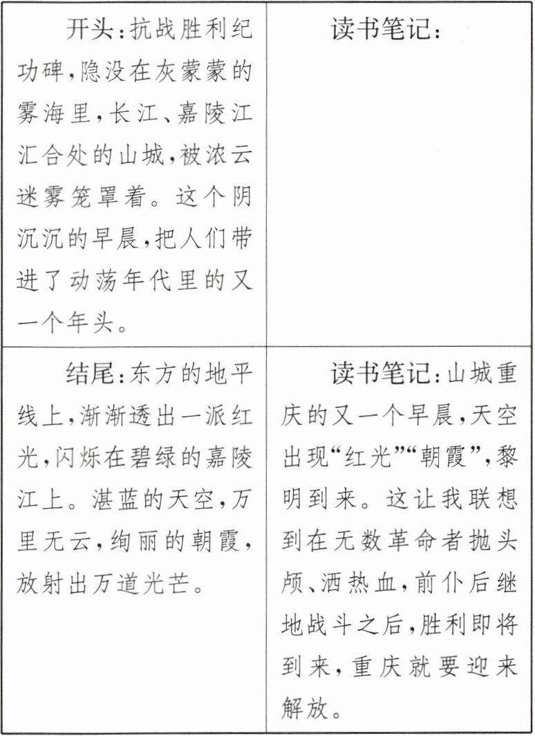 |结尾:东方的地平线上,渐渐透出一派红光,闪烁在碧绿的嘉陵江上。湛蓝的天空,万里无云,绚丽的朝霞,放射出万道光芒。|读书笔记:山城重庆的又一个早晨,天空出现“红光”“朝霞”,黎明到来。这让我联想到在无数革命者抛头颅、洒热血,前仆后继地战斗之后,胜利即将到来,重庆就要迎来解放。|