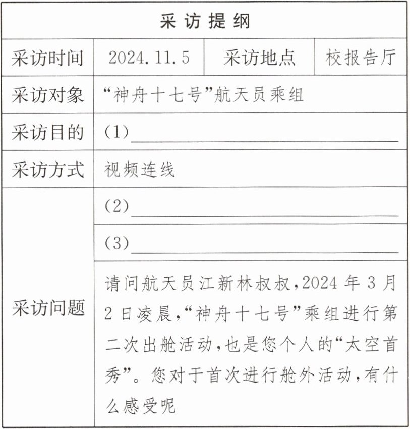 [解析]采访目的可以根据材料二中航天员的经历和感受来写,可以是了解航天员在太空任务中的经历、感受以及他们对未来任务的展望,可以从他们的个人成长、任务挑战、技术突破等方面入手设计。采访问题要与采访目的相关,可以从询问航天员在太空中的具体任务和挑战、了解航天员的个人感受和成长、询问航天员对未来任务的期待和准备等方面进行设计。言之有理即可。