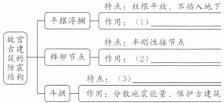 - 斗拱$\n$特点:$(3)______\n$作用:分散地震能量、保护古建筑