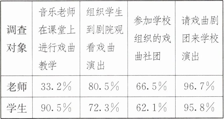 |调查对象|音乐老师在课堂上进行戏曲教学|组织学生到剧院观看戏曲演出|参加学校组织的戏曲社团|请戏曲剧团来学校演出|