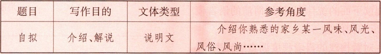 | 自拟 | 介绍、解说 | 说明文 | 介绍你熟悉的家乡某一风味、风光、风俗、风尚…… |