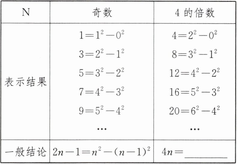 | 一般结论 | $2n-1= n^{2}-(n-1)^{2}$ | $4n= $______ |