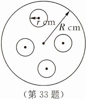 33 如图,在半径为R cm的圆形钢板上,除去半径为r cm的四个小圆,利用因式分解计算当$R= 7.8,r= 1.1$时剩余部分的面积.(π取3.14,结果精确到个位)