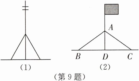 [实践操作]如图(2),淘淘找来两根 5 米长的绳子,一端系在旗杆上的同一位置 A 处,另一端分别固定在地面的两个木桩 B,C 上(两个木桩和旗杆在同一平面内,绳结处的长度误差忽略不计),淘淘现只有一把卷尺.
