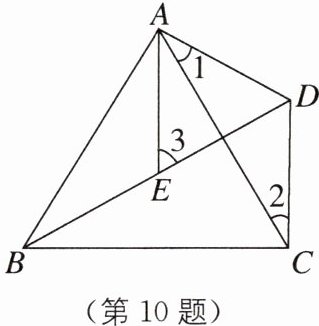 10 手拉手模型如图,已知 AB= AC,AD= AE,BE= CD. (1)求证:∠BAC= ∠EAD; (2)写出∠1,∠2,∠3之间的数量关系,并予以证明.