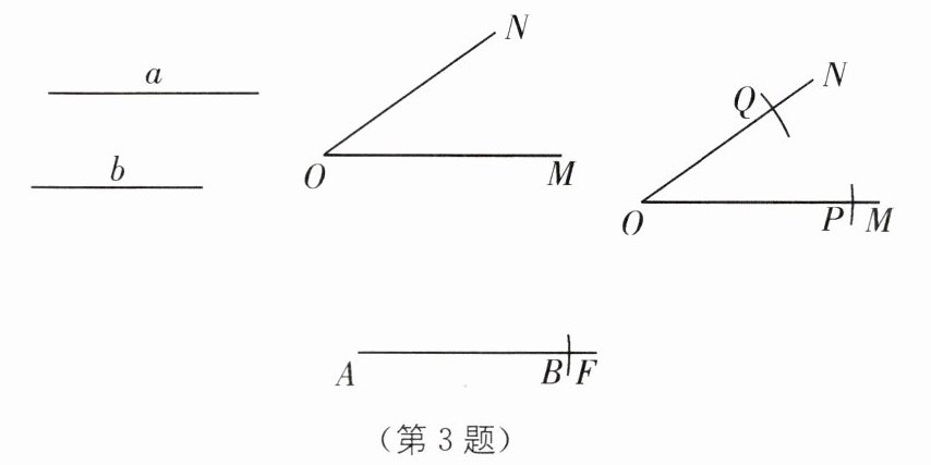 ①以点O为圆心,a长为半径作弧,交OM于点P;②以点O为圆心,b长为半径作弧,交ON于点Q;③作射线AF;④以点A为圆心,OP长为半径作弧,交AF于点B;⑤分别以点A,B为圆心,OQ,PQ长为半径作弧,两弧交于直线AF上方的点C;⑥连接AC,BC,△ABC就是所求作的三角形.