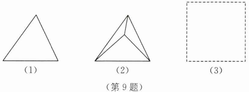 9 (2025·江苏苏州姑苏区立达中学期中)如图,图(1)中有1个三角形,在图(1)中的三角形内部(不含边界)取一点,连接该点与三角形的 3 个顶点得到图(2),图(2)中共有 4 个三角形. 若在图(2)中的一个小三角形内部(不含边界)取一点,连接该点与该小三角形的 3 个顶点得到图(3). 在虚线框中画出图(3),图(3)中共有______个三角形.(写出所有可能的值)