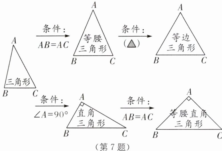 7 教材 P2 探究·拓展 小明同学复习几种三角形的关系时发现,通过增加特殊的边或者角的条件能得到新的三角形,通过小明整理的思维导图,请帮他在括号内填上一个适当的条件______.(只需填上一个即可)