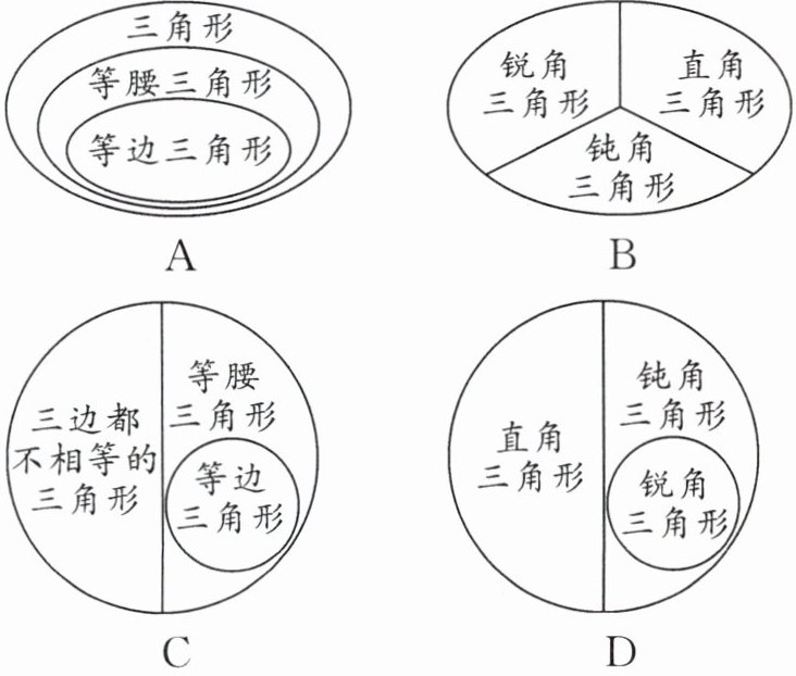5 (2025·安徽安庆岳西月考)用下面的图表示三角形的分类,其中不正确的是( ).