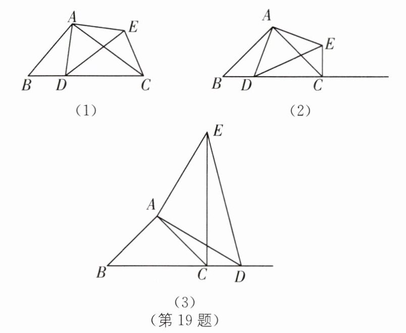 19 中考新考法 类比探究 如图(1),在△ABC中,∠ACB为锐角. 点D为射线BC上一动点,连接AD,以AD为一边且在AD的右侧作等腰直角三角形ADE,AD= AE,∠DAE= 90°. 解答下列问题: