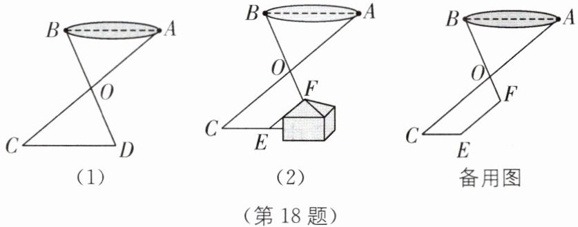 18 新情境 构建模型 如图(1),为测量池塘宽度AB,可在池塘外的空地上取任意一点O,连接AO,BO,并分别延长至点C,D,使OC= OA,OD= OB,连接CD.