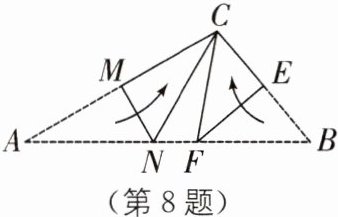 8 如图,在△ABC 中,∠A= 30°,∠B= 50°,将点 A 与点 B 分别沿 MN 和 EF 折叠,使点 A,B 与点 C 重合,则∠NCF 的度数为( ).