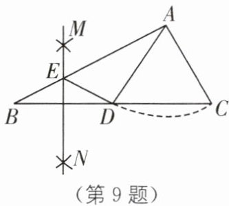 9 (2025·四川南充期末)如图,在△ABC 中,以点 A 为圆心,AC 的长为半径作弧交 BC 于点 D,再分别以点 B 和点 D'为圆心,大于$\frac{1}{2}BD$的长为半径画弧,两弧相交于 M,N 两点,作直线 MN 交 AB 于点 E,连接 DE,AD.若△ADE 的周长为 8,AC= 3,则 AB 的长为( ).