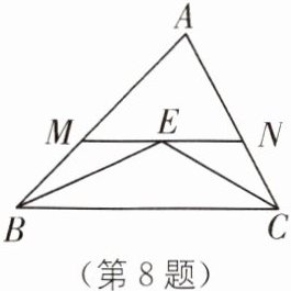 8 双角平分线模型 (2025·广东潮州饶平期末)如图,在$\triangle ABC$中,$\angle ABC和\angle ACB$的平分线交于点 E,过点 E 作 MN$//$BC 交 AB 于点 M,交 AC 于点 N,若 BM= 4,CN= 3,则线段 MN 的长为( ).