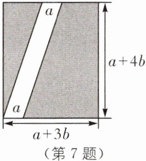 7 教材 P111 习题 T10·变式 (2025·青海果洛州达日期末改编)为了更好地开展劳动教育,某学校暑期对学校闲置的地块进行规划改造,已知该地块如图是长为 $(a + 4b)$ 米,宽为 $(a + 3b)$ 米的长方形地块,学校准备在该地块内修一条平行四边形小路,小路的底边宽为 a 米,并计划将阴影部分改造为种植区. 用含有 a,b 的式子分别表示出小路面积 $S_1$ 和种植区的总面积 $S_2$.(请将结果化为最简)