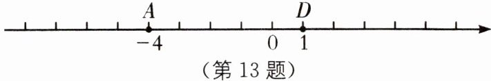 13 (2025·湖北黄冈黄梅期中)如图,数轴上从左到右依次有点A,B,C,D,其中点C为原点,A,D所对应的数分别为-4,1,B,D两点间的距离是3.