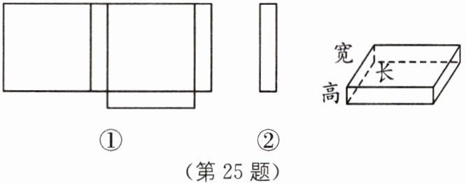 25 中考新考法 操作探究 小明在学习了《转化 表达》这一课后,明白了很多几何体都能展开成平面图形.于是他在家用剪刀展开了一个长方体纸盒,可是一不小心多剪了一条棱,把纸盒剪成了两部分,即图中的①和②.根据你所学的知识,回答下列问题: