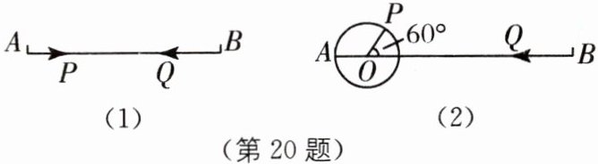 ∴点P绕着点O旋转60°或240°刚好在线段AB上。当点P绕着点O旋转60°时,点P和点Q相遇,点P旋转了60÷30=2(s),则点Q的速度为(20−4)÷2=8(cm/s);当点P绕着点O旋转240°时,点P和点Q相遇,点P旋转了240÷30=8(s),则点Q的速度为20÷8=$\frac{5}{2}$(cm/s)。综上所述,点Q的速度为8 cm/s或$\frac{5}{2}$ cm/s。