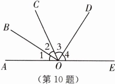 10 教材P166练习T2·拓展 如图,点A,O,E在同一条直线上,OB,OC,OD都是射线,$∠1= ∠2$,$∠1与∠4$互为余角。