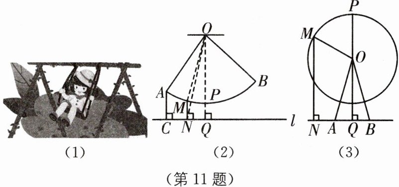 图(3)是摩天轮的示意图,OA,OB是摩天轮的两根支架,OP,OM都是摩天轮的半径,且OP= OM.MN⊥AB,PQ⊥AB,垂足分别为N,Q,PQ经过圆心O.小华发现PQ>MN,请根据学过的基本事实,证实这个发现.