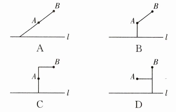8 如图,河道l的一侧有A,B两个村庄,现要铺设一条引水管道把河水引向A,B两村,下列四种方案中最节省材料的是(