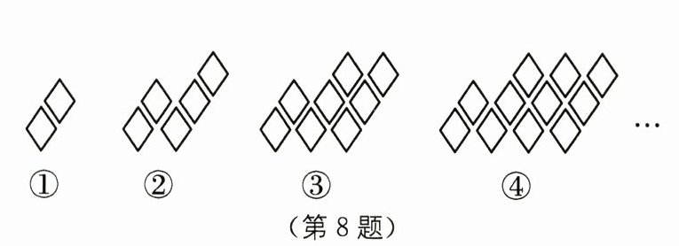 8. (2024·重庆中考)用菱形按如图所示的规律拼图案,其中第①个图案中有2个菱形,第②个图案中有5个菱形,第③个图案中有8个菱形,第④个图案中有11个菱形,…,按此规律,则第⑧个图案中,菱形的个数是( ).