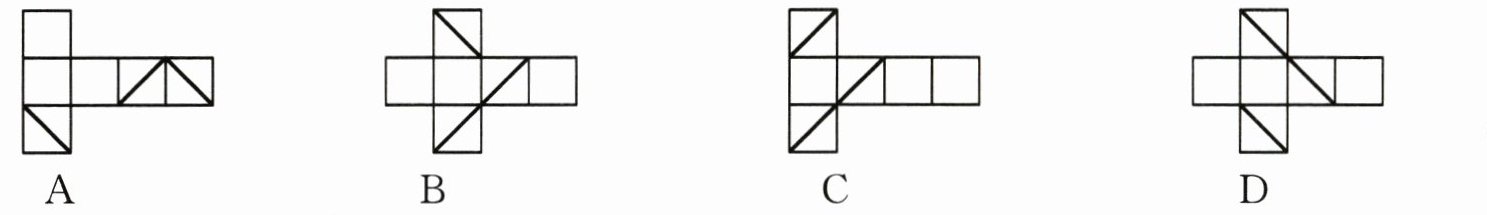 8. 如图,正方体盒子的外表面上画有3条粗黑线,将这个正方体盒子的表面展开,外表面朝上,展开图可能是( ).