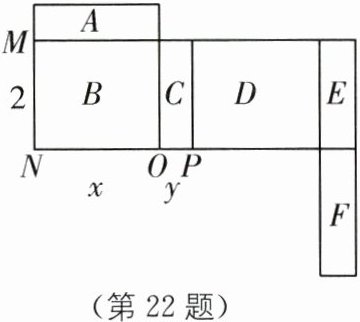 22. (8分)如图是一个长方体的表面展开图,一共标有A,B,C,D,E,F六个面,$MN = 2$,$NO = x$,$OP = y$.请根据要求回答: