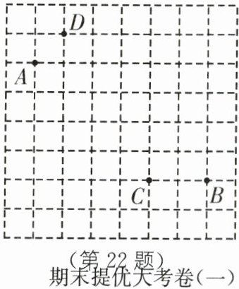 22. (8分)如图,已知$A,B,C,D$是正方形网格纸上的四个格点,根据要求仅用无刻度的直尺在网格中画图,并标注相关字母.