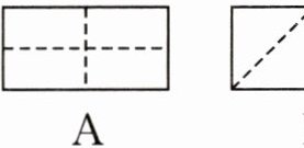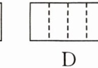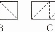 1 (教材 P6“折纸与剪拼”·变式)现有一张长和宽之比为 $ 2:1 $ 的长方形纸片,将它折两次(第一次折后也可打开铺平再折第二次),使得折痕将纸片分为面积相等且不重叠的四个部分。下列四个图形是折后打开铺平的图形(虚线表示折痕),则不符合题中要求的是(