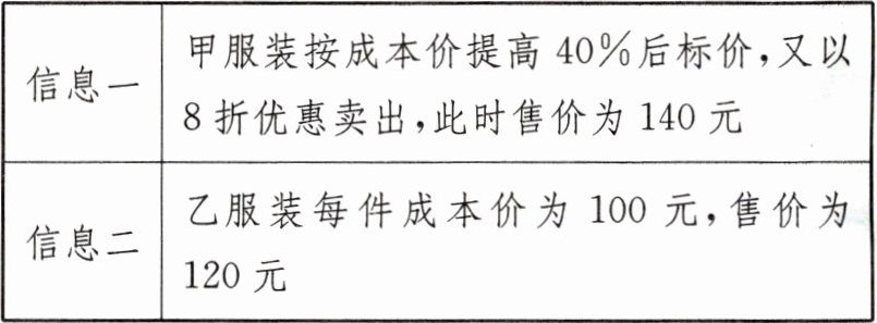 | 信息一 | 甲服装按成本价提高40%后标价,又以8折优惠卖出,此时售价为140元 |