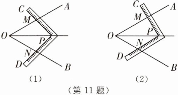 (2)小华同学动手操作,把角尺的直角顶点放在如图(2)的位置,使得 ON= NP,同时 PM⊥OA.求证:OP 平分∠AOB.