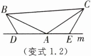 变式1.2 如图,在$\triangle ABC$中,$AB= AC$,$D$,$A$,$E三点都在直线m$上,并且有$\angle BDA= \angle AEC= \angle BAC= \alpha$,其中$\alpha$为任意锐角或钝角.请问结论$DE= BD+CE$是否成立?若成立,请你给出证明;若不成立,请说明理由.