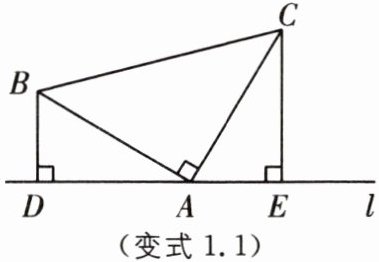 变式1.1 某学习小组在探究三角形全等时,发现了下面这种典型的基本图形.如图,已知:在$\triangle ABC$中,$\angle BAC= 90^\circ$,$AB= AC$,直线$l经过点A$,$BD \perp直线l$,$CE \perp直线l$,垂足分别为$D$,$E$.证明:$DE= BD+CE$.