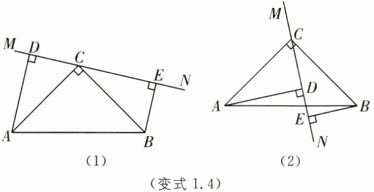 变式1.4 在$\triangle ABC$中,$\angle ACB= 90^\circ$,$AC= BC$,直线$MN经过点C$,且$AD \perp MN于点D$,$BE \perp MN于点E$.