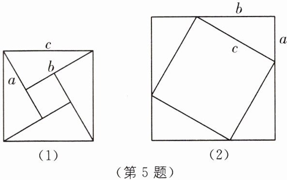 5. 提分优练 (2024·无锡江阴期中)2002年8月,在北京召开的国际数学家大会会标取材于我国古代数学家赵爽发现的“弦图”,它是由四个大小相等,形状相同的直角三角形与中间的小正方形拼成的一个大正方形(如图(1)),设直角三角形的较短直角边为 $ a $, 较长直角边为 $ b $, 最长的斜边为 $ c $.