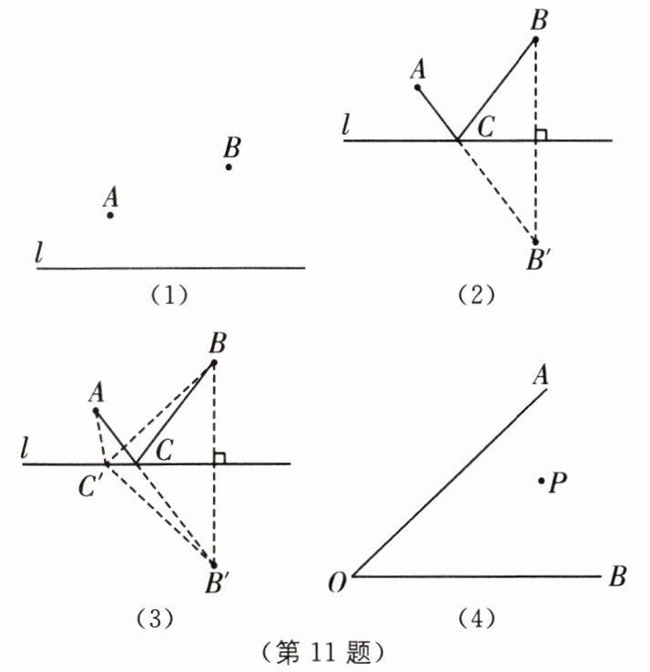 小亮:如图(3),在直线 l 上另取任一点 C',连接 AC',BC',B'C',我只要证明 AC+CB<AC'+C'B.
