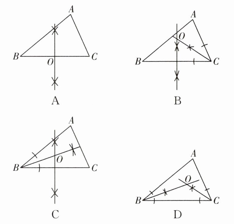 1 教材 P38 例 2·变式 (2024·南宁一模)某旅游景区内有一块三角形绿地 ABC(AC≠BC),现要在绿地 ABC 内建一个休息点 O,使它到 AB,BC,AC 三边的距离相等,下列作法正确的是(