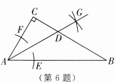6 (2025·常州溧阳期中)如图,在△ABC中,∠C= 90°,按以下步骤作图:①以点A为圆心,小于AC的长为半径画弧,分别交AB,AC于点E,F;②分别以点E,F为圆心,大于$\frac{1}{2}EF$的长为半径画弧,两弧相交于点G;③作射线AG交BC边于点D,若CD= 6,AB= 15,则△ABD的面积为(