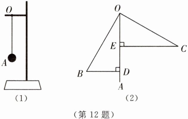 12 跨学科 声音的产生 小亮同学在物理课上学习了发声物体的振动实验后,对其做了进一步的探究:如图(1),在一个支架的横杆点O处用一根细绳悬挂一个小球A,小球A可以自由摆动,摆动过程中绳子的伸长不考虑且绳子始终是绷直的. 如图,OA表示小球静止时的位置. 当小明用发声物体靠近小球时,如图(2),小球从OA摆到OB位置,此时过点B作BD⊥OA于点D,当小球摆到OC位置时,过点C作CE⊥OA于点E,测得BD= 7 cm,OE= 7 cm. (图中的A,B,O,C在同一平面上),求证此时OB⊥OC.