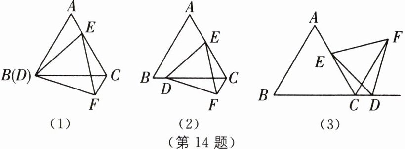 14 中考新考法 类比探究 如图,在等边三角形ABC中,点E是边AC上一定点,点D是直线BC上一动点,以DE为一边作等边三角形DEF,连接CF.