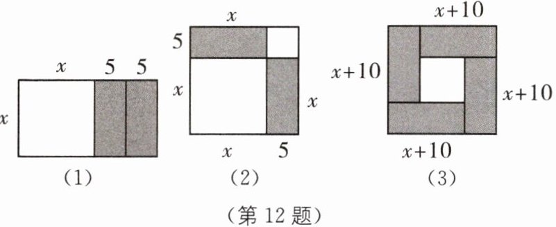 如图(3),用4个长都是$(x+10)$、宽都是x的相同矩形,拼成如图(3)所示的正方形。