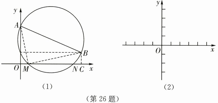26. (12分)中考新考法解题方法型阅读理解题[新知]19世纪英国著名文学家和历史学家卡莱尔给出了一元二次方程$x^{2}+bx+c= 0$的几何解法:如图(1),在平面直角坐标系中,已知点$A(0,1)$、$B(-b,c)$,以AB为直径作$\odot P$.若$\odot P$交x轴于点$M(m,0)$、$N(n,0)$,则m、n为方程$x^{2}+bx+c= 0$的两个实数根.